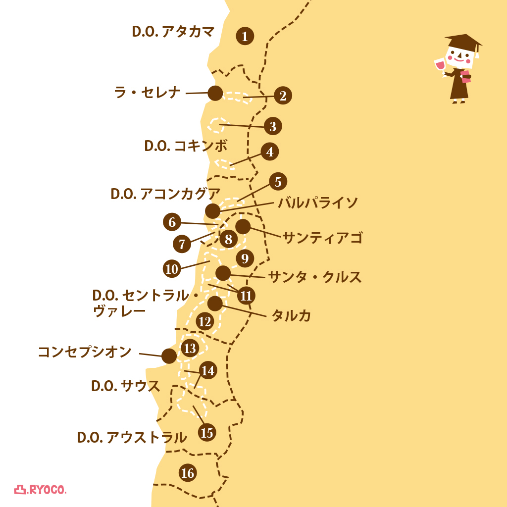 P.462「チリの原産地呼称DO一覧表」をごらんください。チリのワイン産地は、下記の6つのリージョン(地方) + 1つの特別な呼称に分かれます。続けてP.456左〜の解説を読み、各リージョンの位置と特徴を簡潔に覚えましょう。