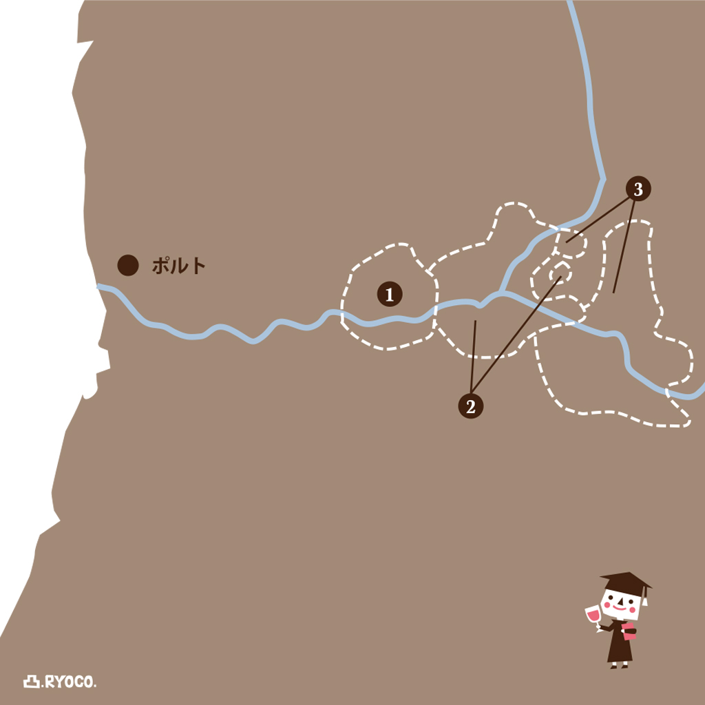 例題: 下記の画像はポルトガル、ポートとドウロ地区のワイン産地の地図です。地図上で2番の産地名を選択してください。