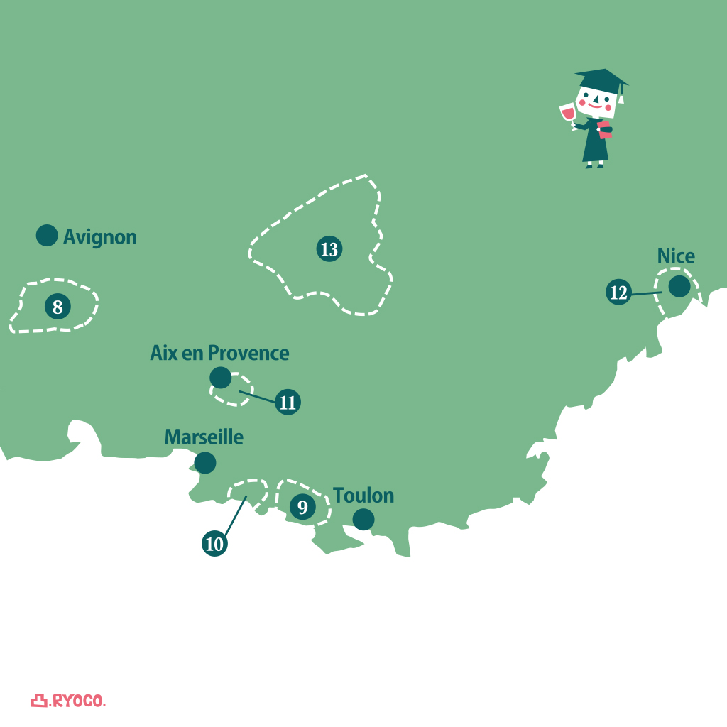プロヴァンス地方で重要なAOCは下記の5つです。該当箇所を一読して特徴を覚えましょう。